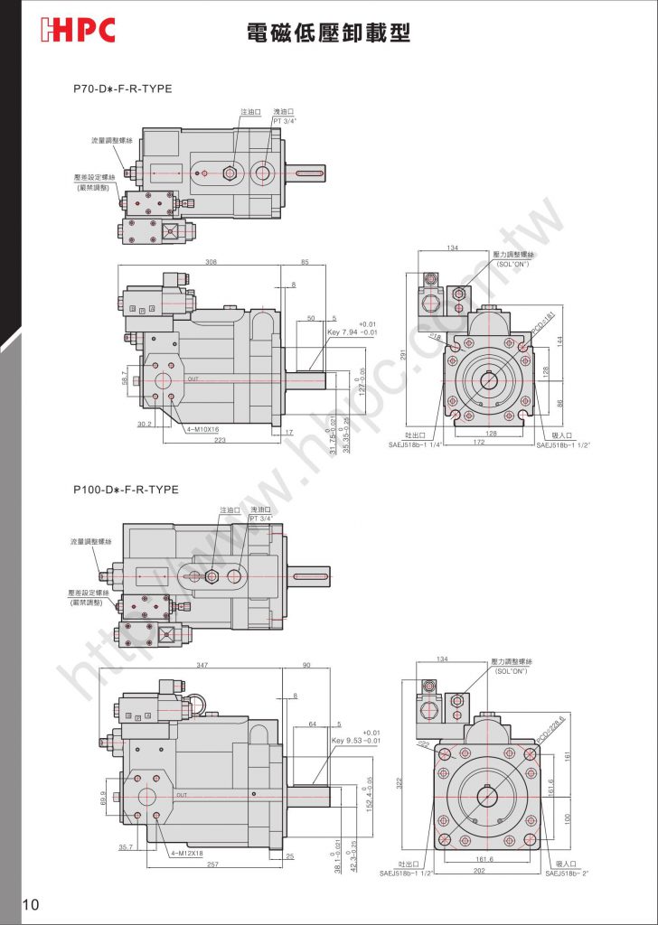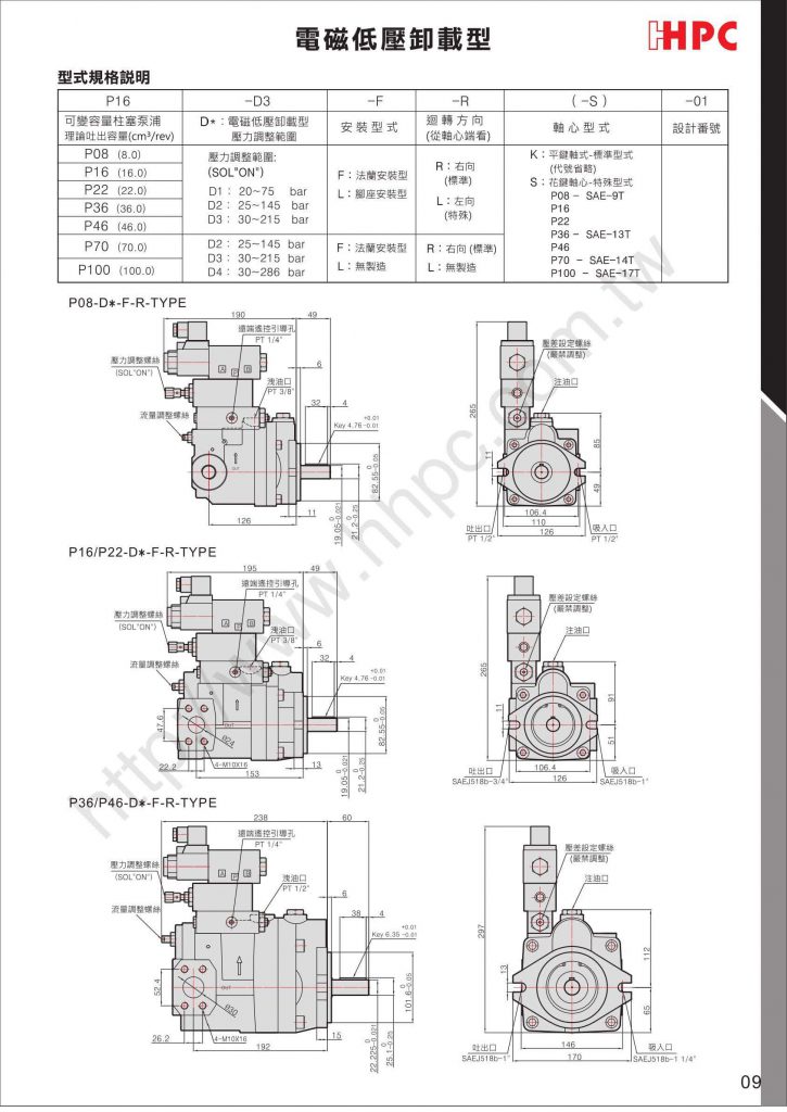P16-D3-F-R-01電磁低壓卸載型 D_Type產品特色說明 當通過泵浦上安裝的電磁方向閥的換向,可做低壓卸載的功能和切換成壓力控制的功能形式使用。 適合於系統壓待機較長的情況,搭配此功能可減少能源的浪費...