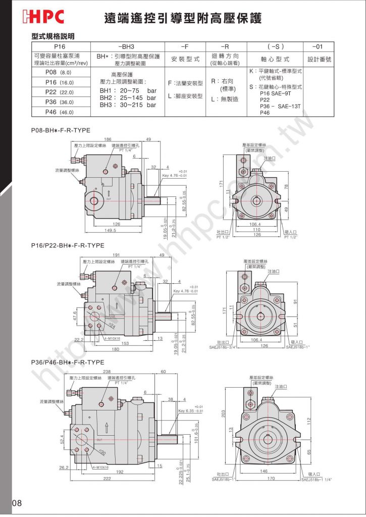 P16-BH3-F-R-01遠端遙控引導型附高壓保護 BH_Type產品特色說明 當油泵的輸出壓力接近設定壓力時,則油泵的流量自動減少到最小流量,保持設定的壓力。 設定的壓力用手動調整。